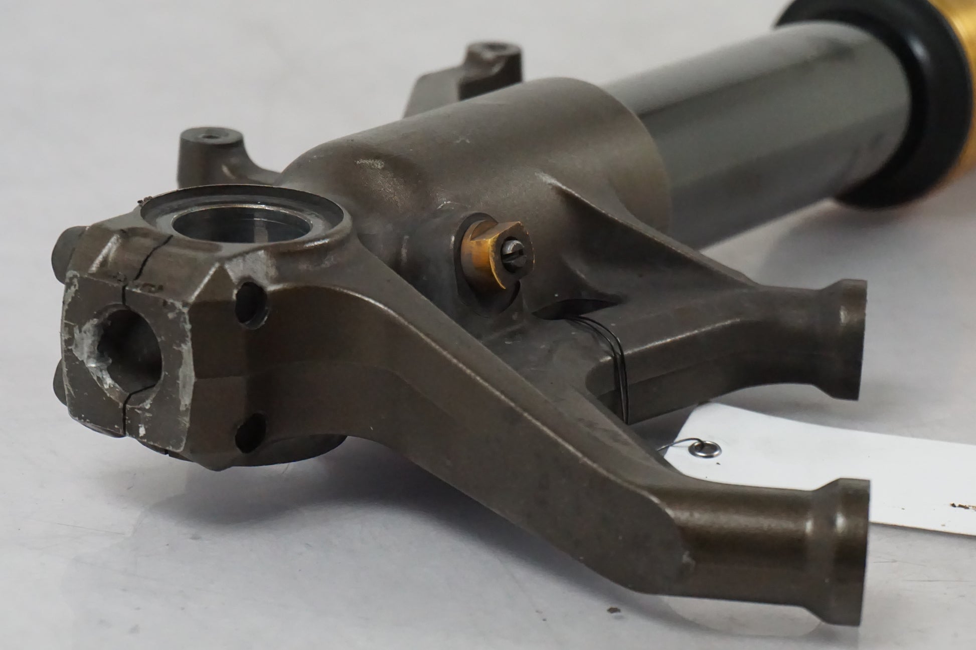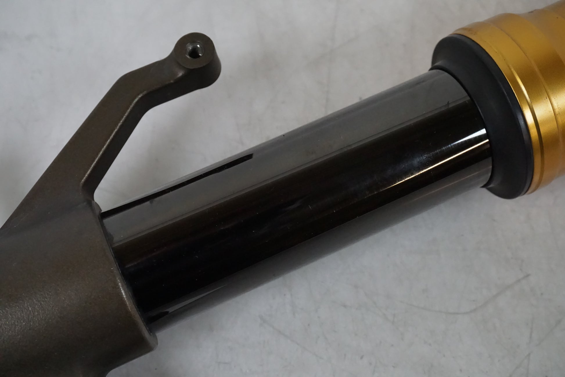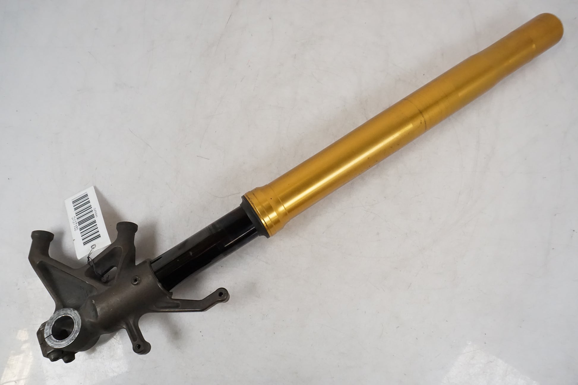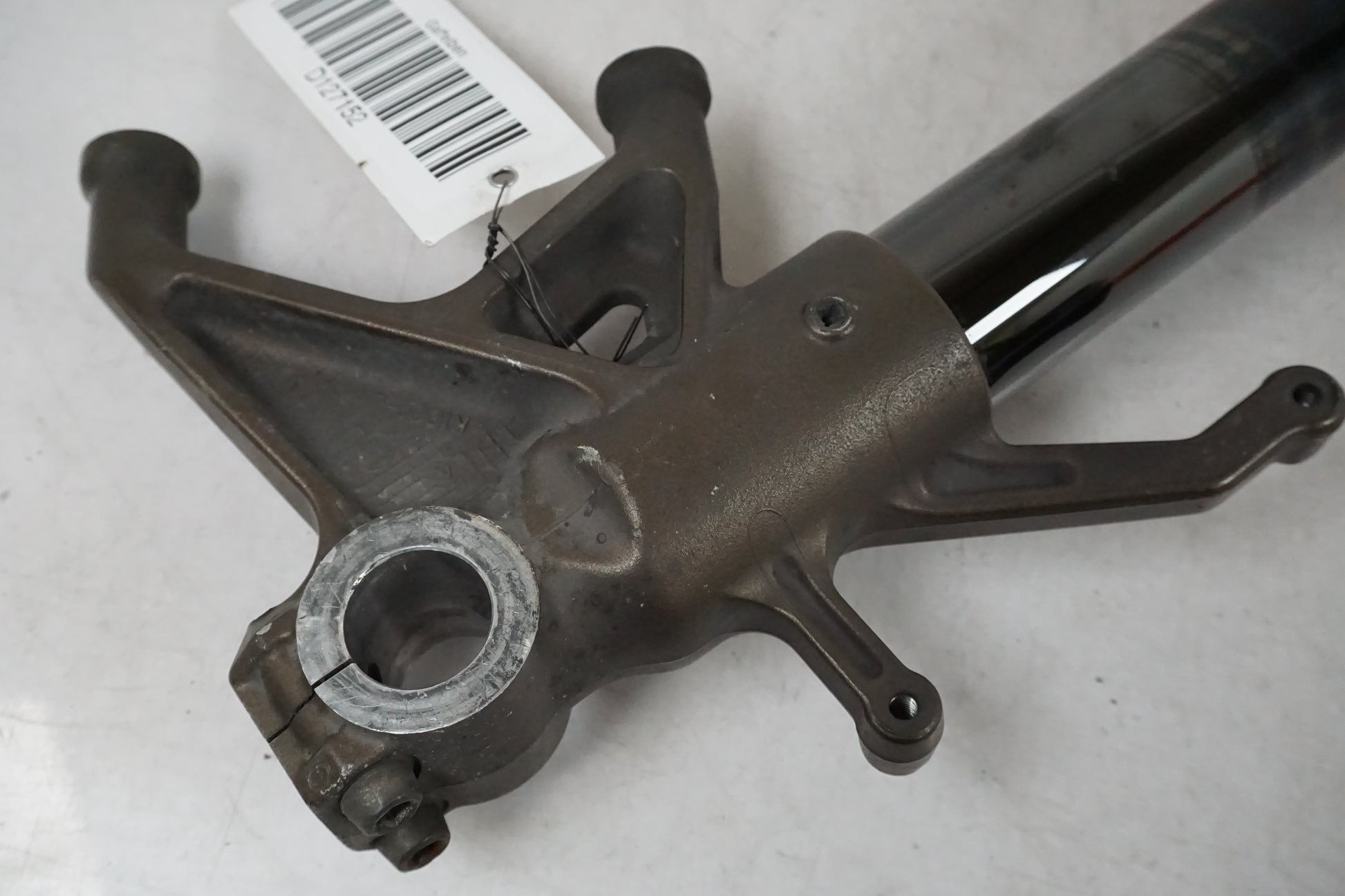 Gauche. Humide depuis le joint. De petites rayures se trouvent sur la fourche interne, voir image. Moins d'usure de la peinture là où l'axe de roue est, voir image.