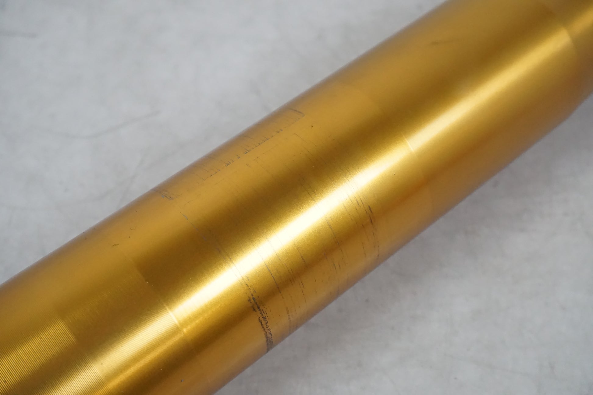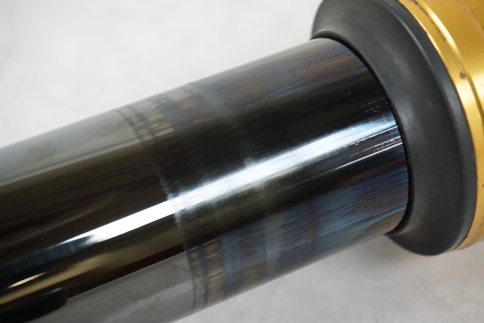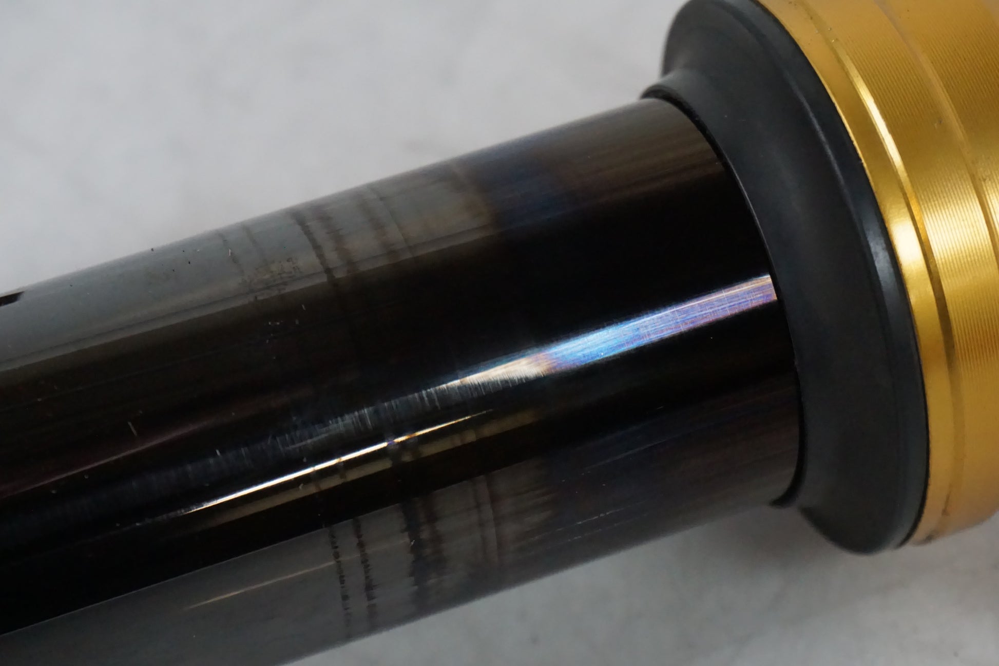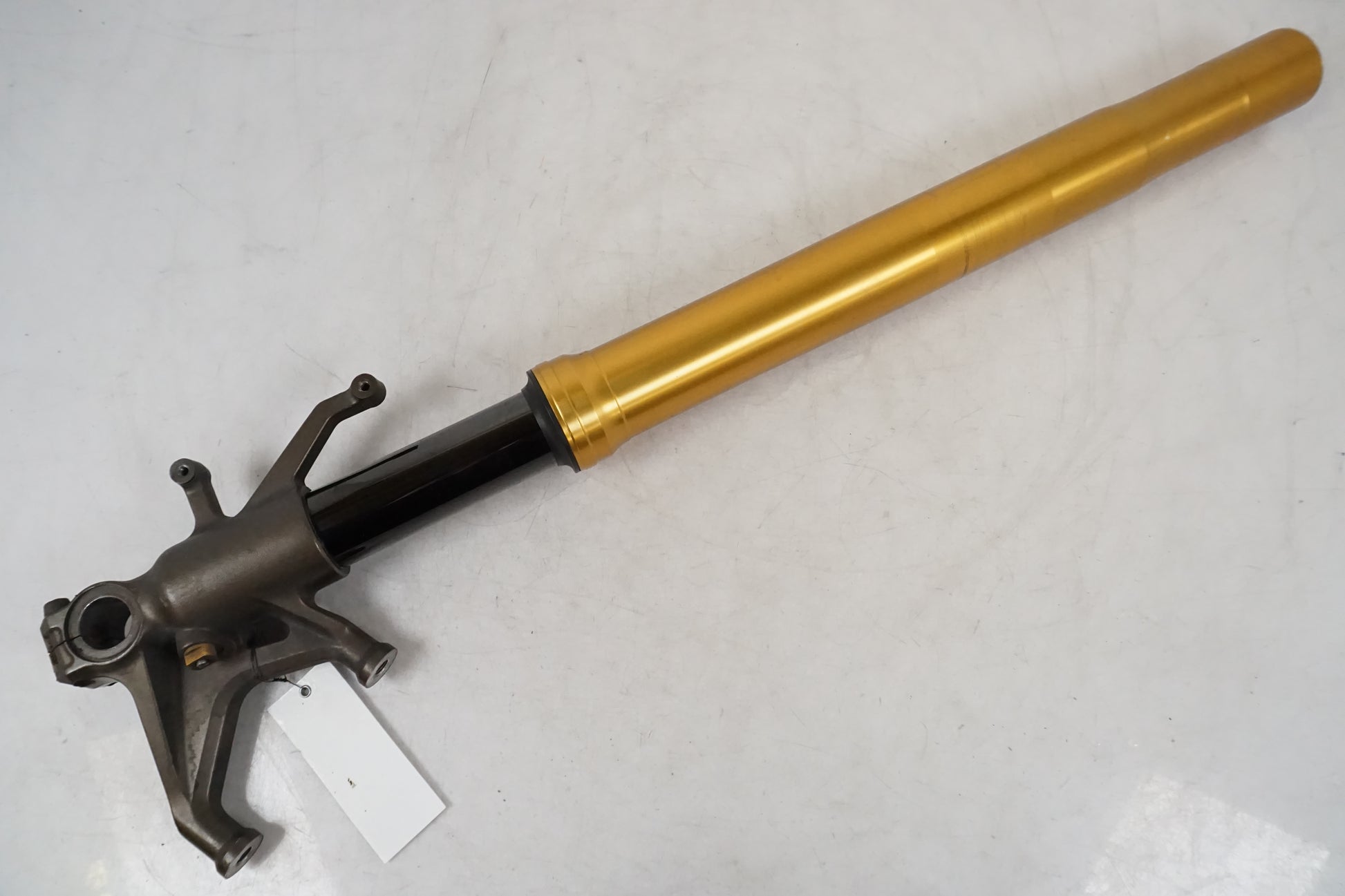 Gauche. Humide depuis le joint. De petites rayures se trouvent sur la fourche interne, voir image. Moins d'usure de la peinture là où l'axe de roue est, voir image.