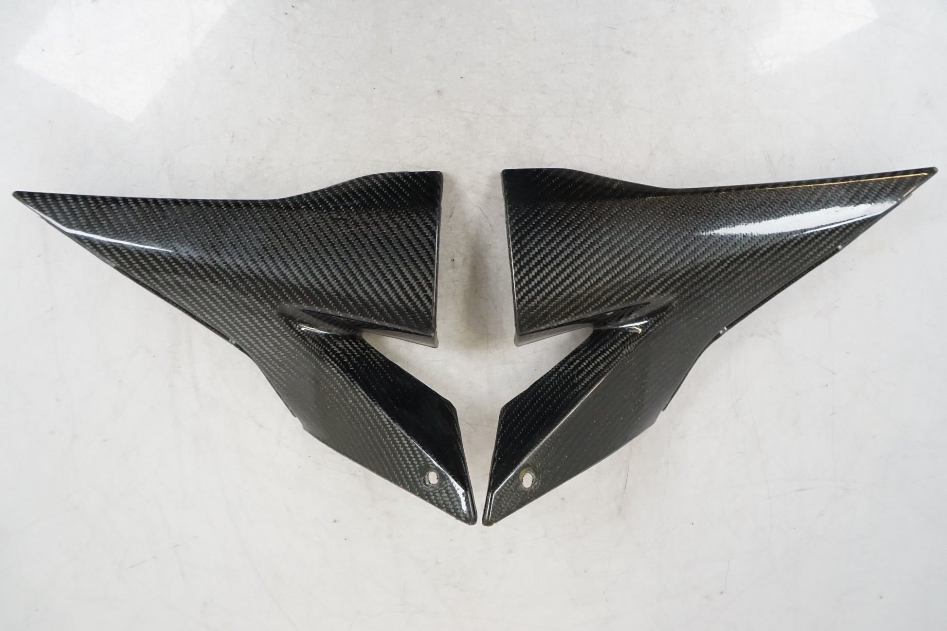 Äkta kolfiber, Trasiga fästen se bilder. Behöver lagas innan montering. Säljs som par.