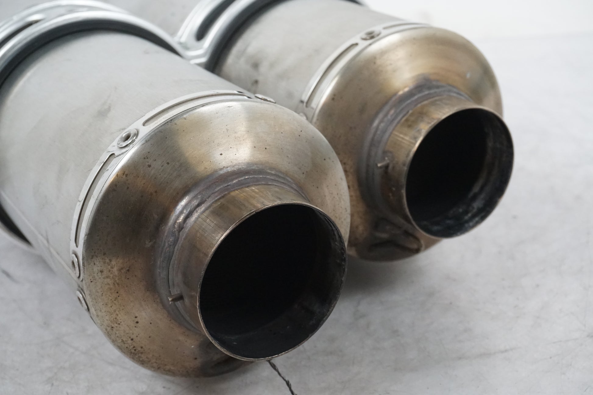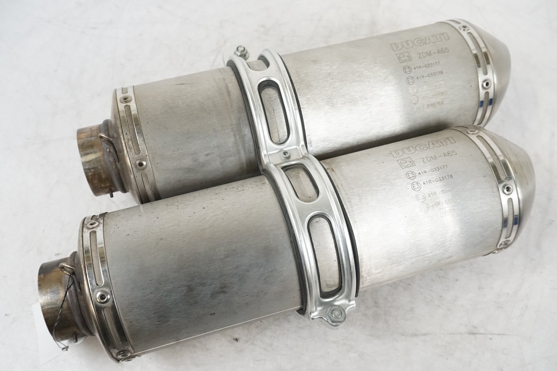 Silencieux Supérieur/Inférieur de Ducati Streetfighter 2012. Avec 57313252A. Avec collier de silencieux 74110471A. Joint, collier 78810831A. Silencieux supérieur légèrement bosselé et avec moins de marques, voir images. Sans ressorts.