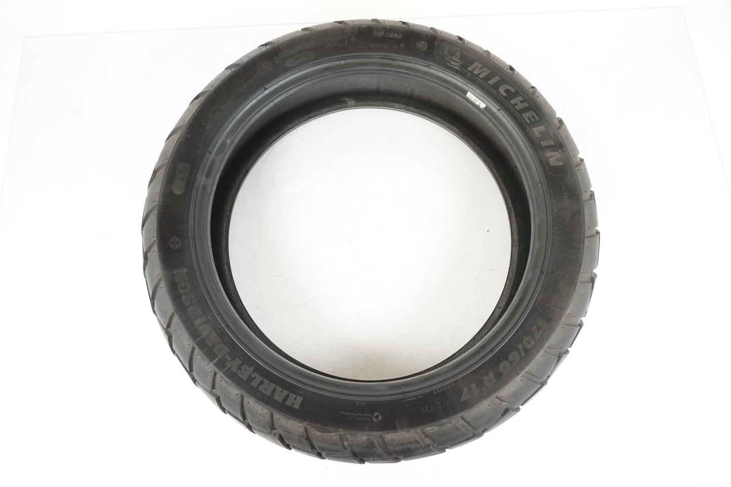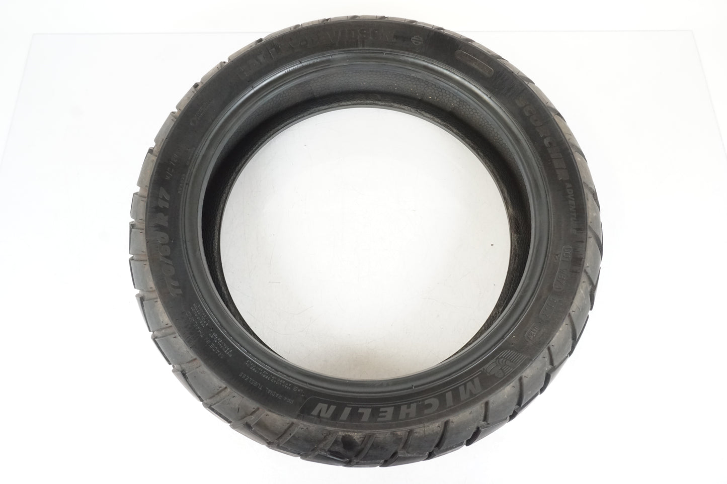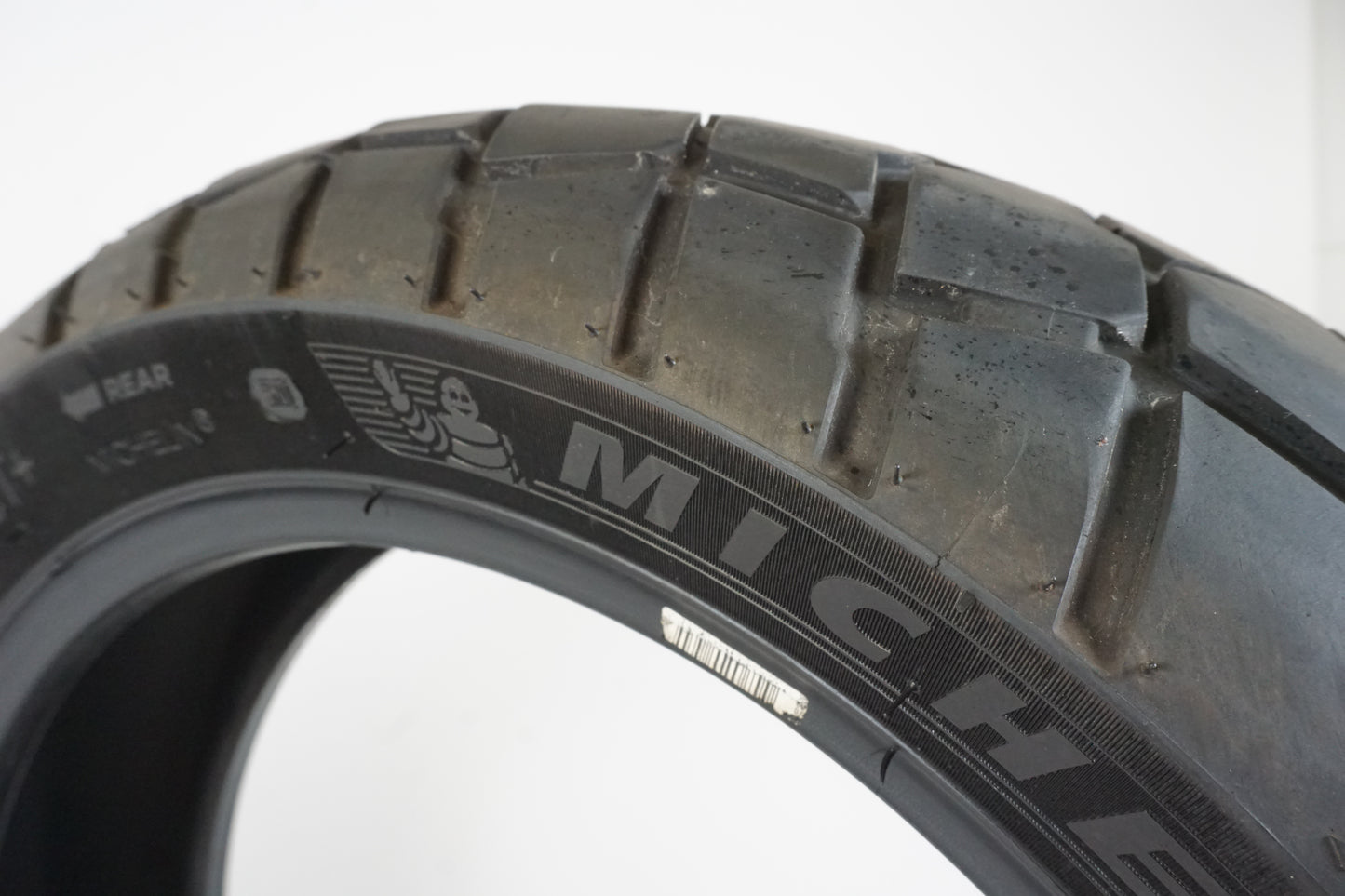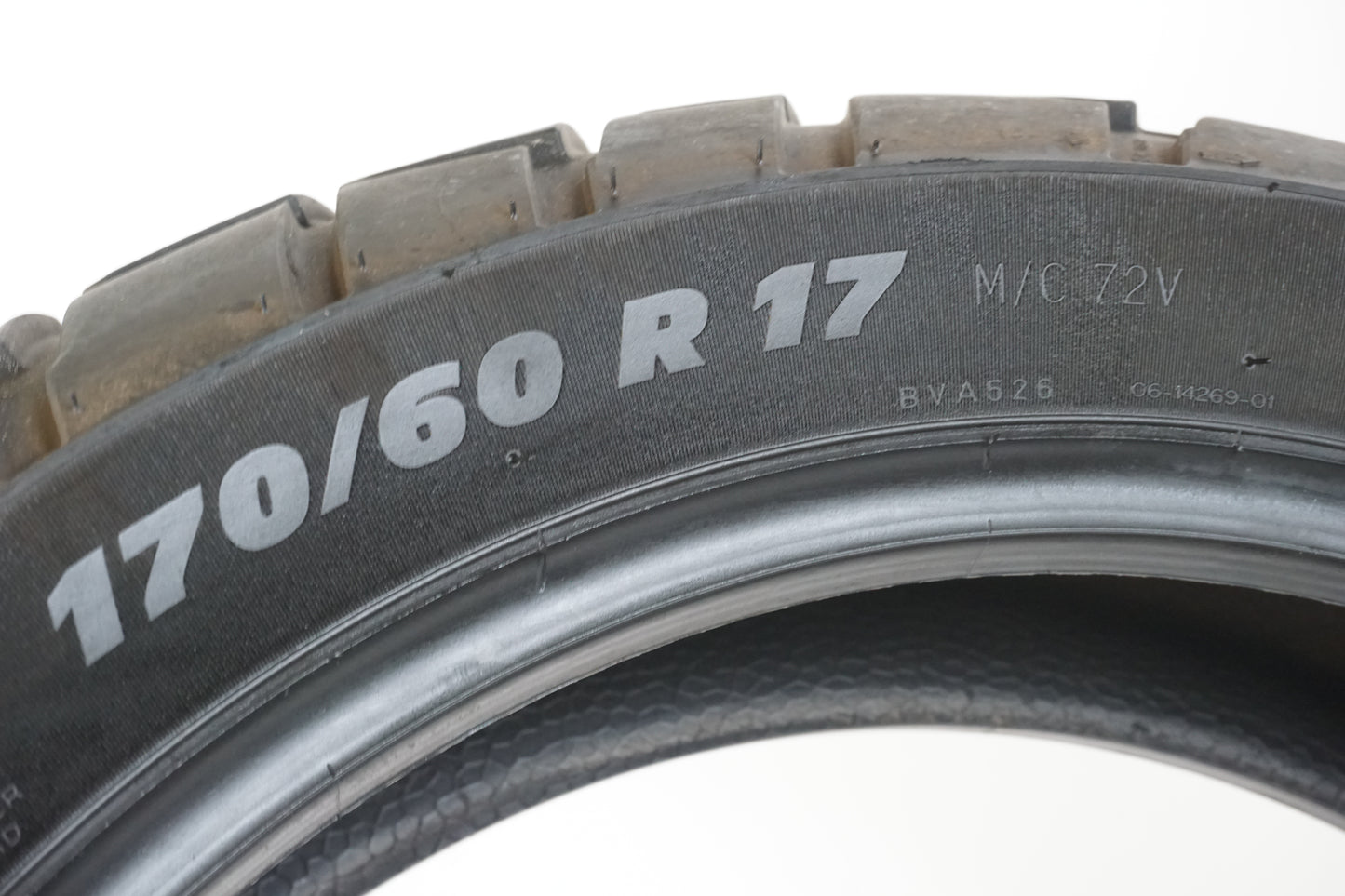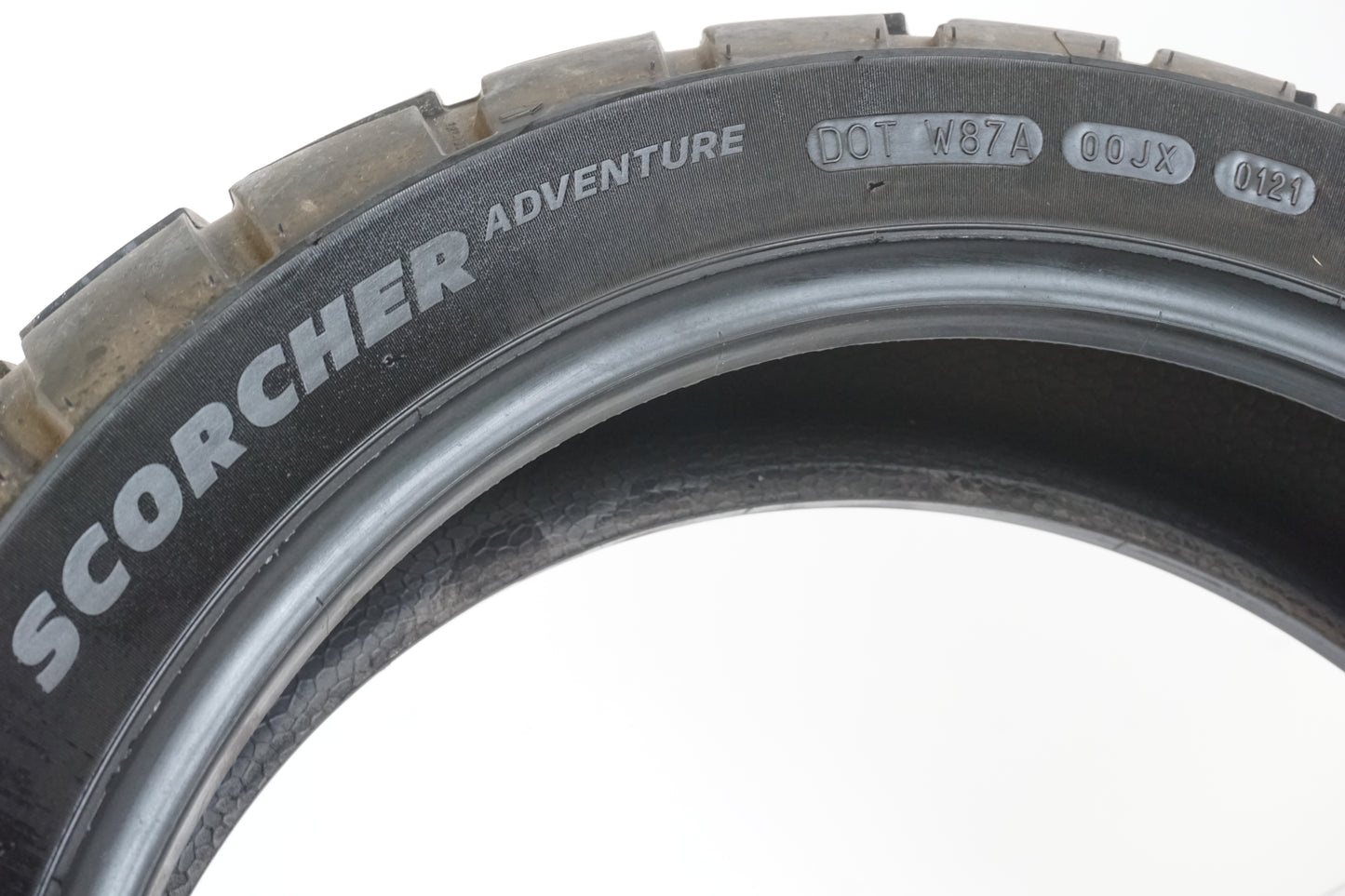 Däck från Michelin modell Scorcher Adventure med 1,90milimeter kvar. 170/60R17 (M/C 72V) Tillverkat v01 år 2021. Lite plattslitet mitt i körbanan. Postion: bak.