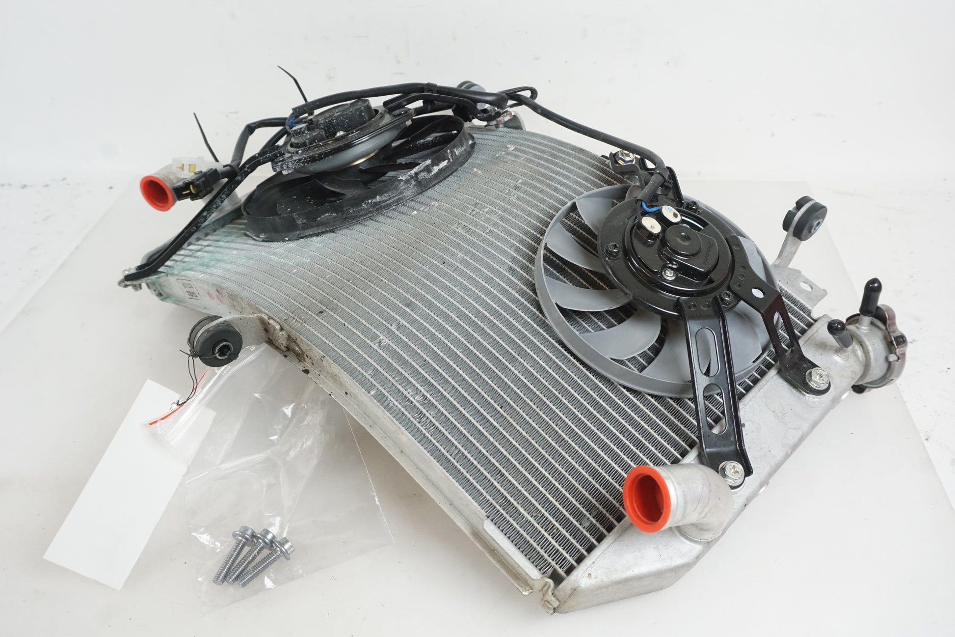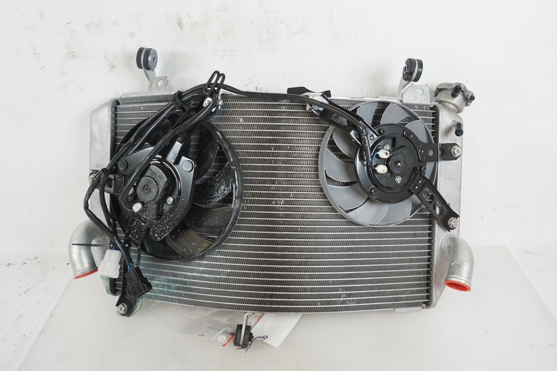 Vattenkyl med kylfläktar i bruksskick, Den svarta fläkten har gått emot kylen i nederkant och det nedre fästet till den fläkten verkar böjt bakåt som åtgärd.