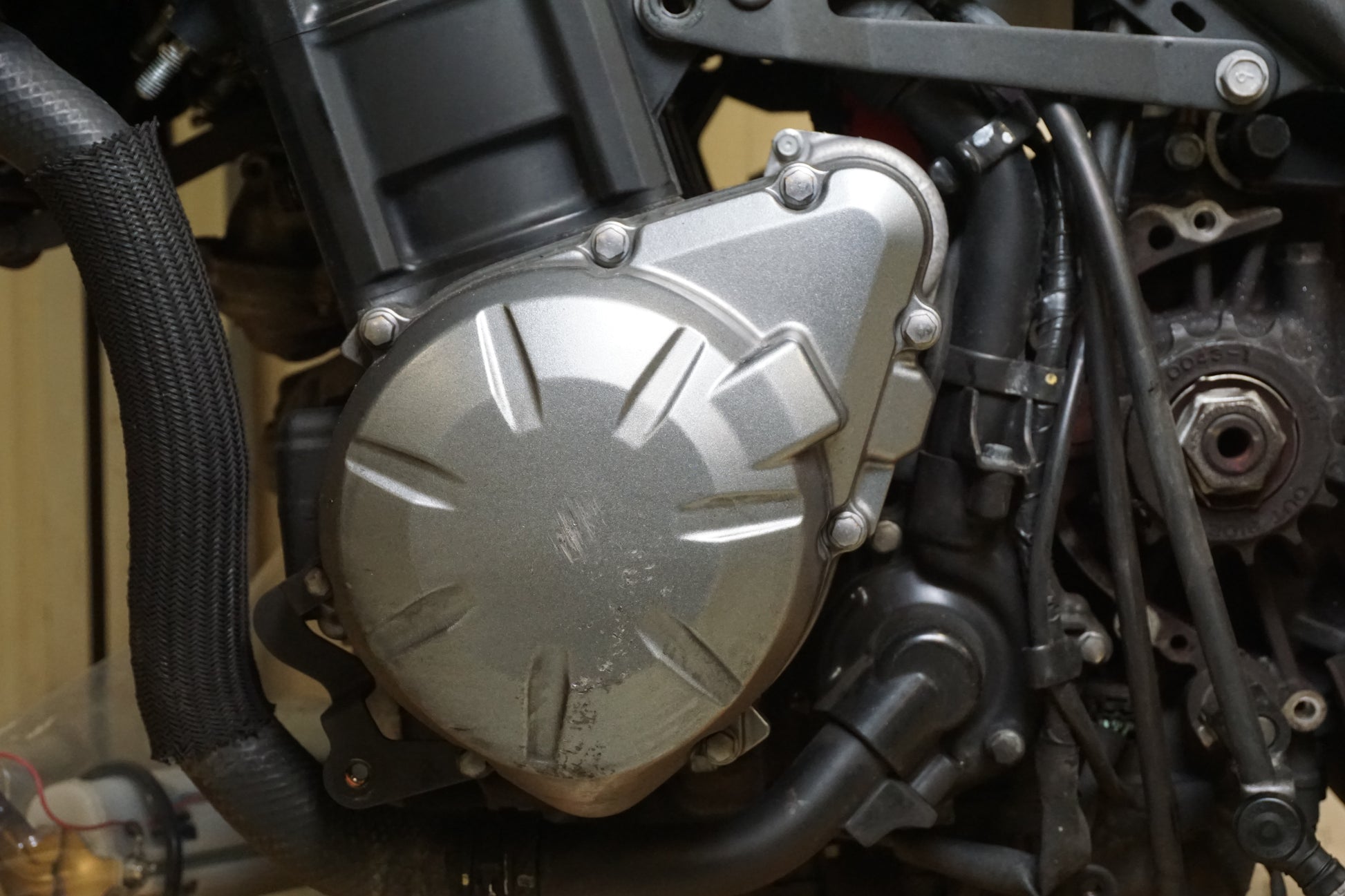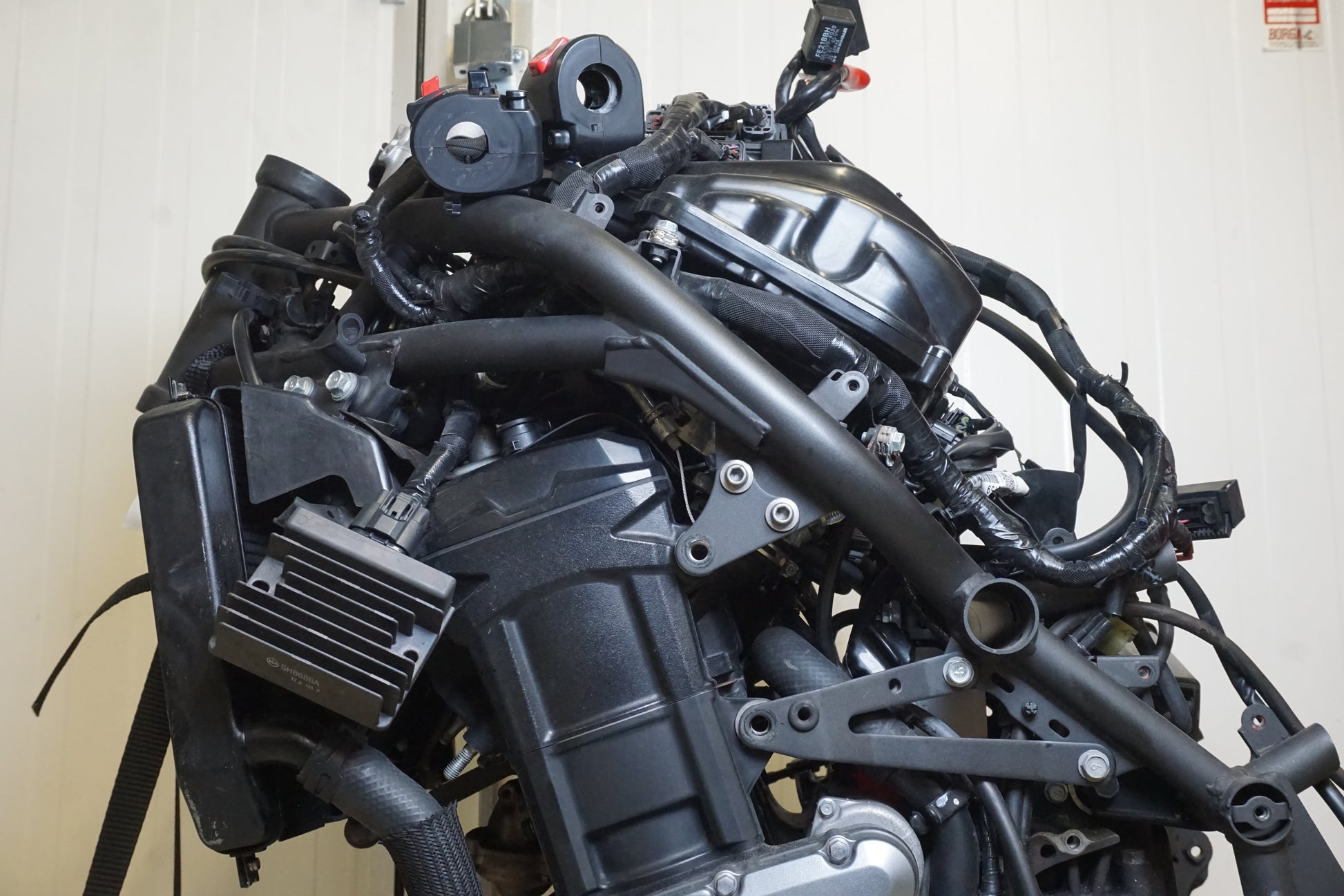 En spik eller liknande har gått igenom Kopplingskåpan koppling är sannolikt skrot då motorcykeln dör när man lägger i första växeln. Motorn startar och går utan missljud på tomgång. Motorpaket med följande: låssats, ECU, instrument, luftburk, kyl och mycket mer.